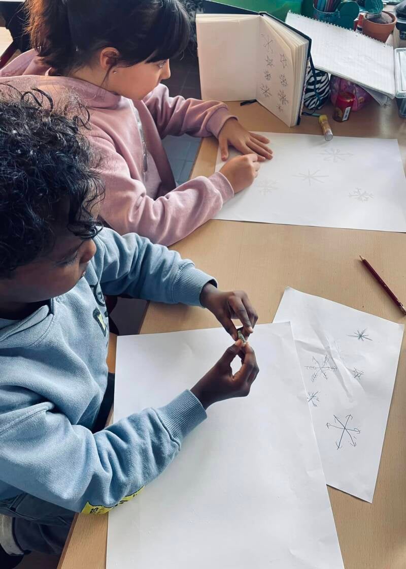 - Met witte wasco's tekenden we ijskristallen op een A3-blad